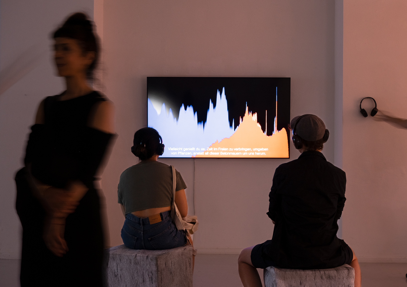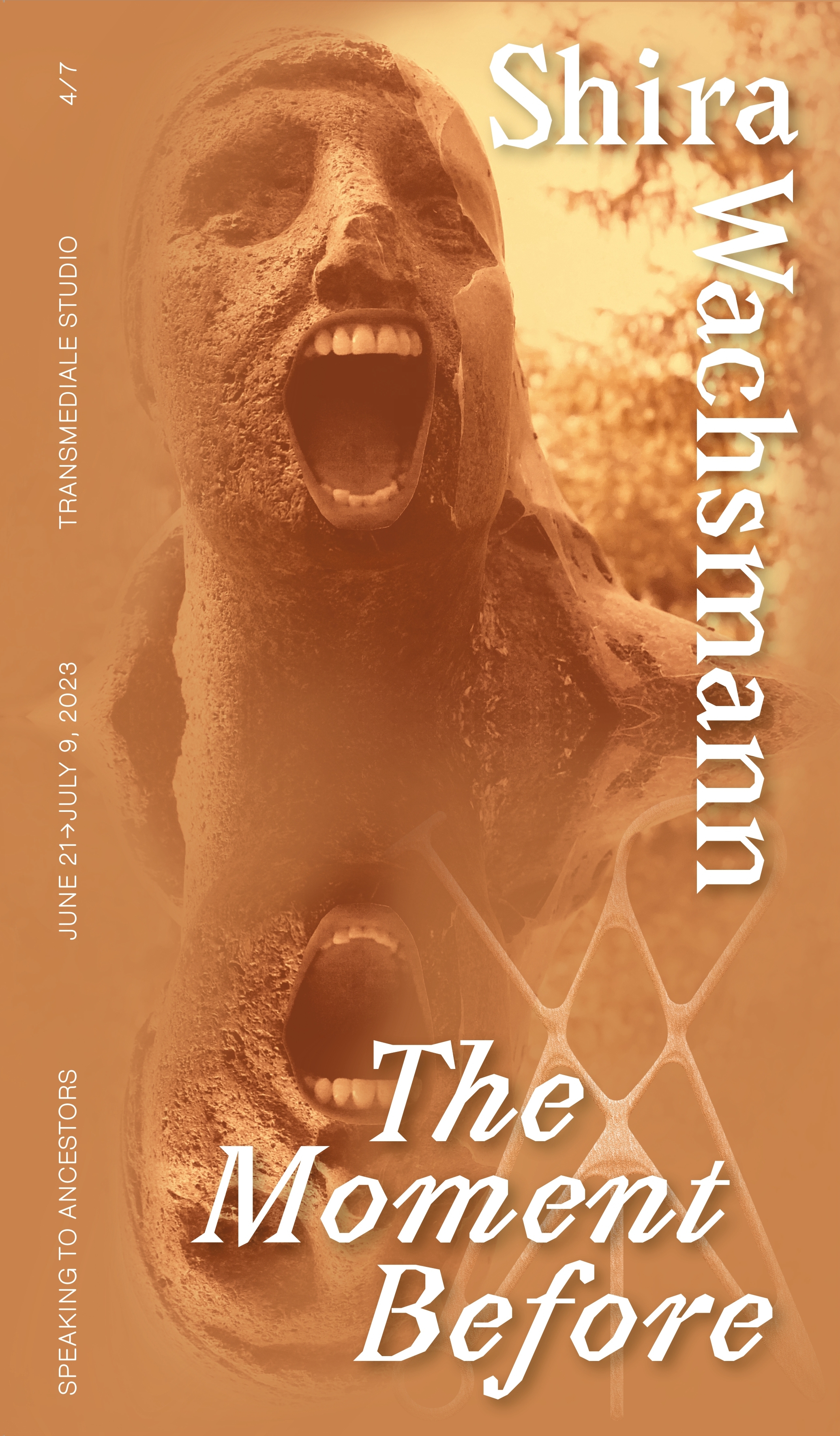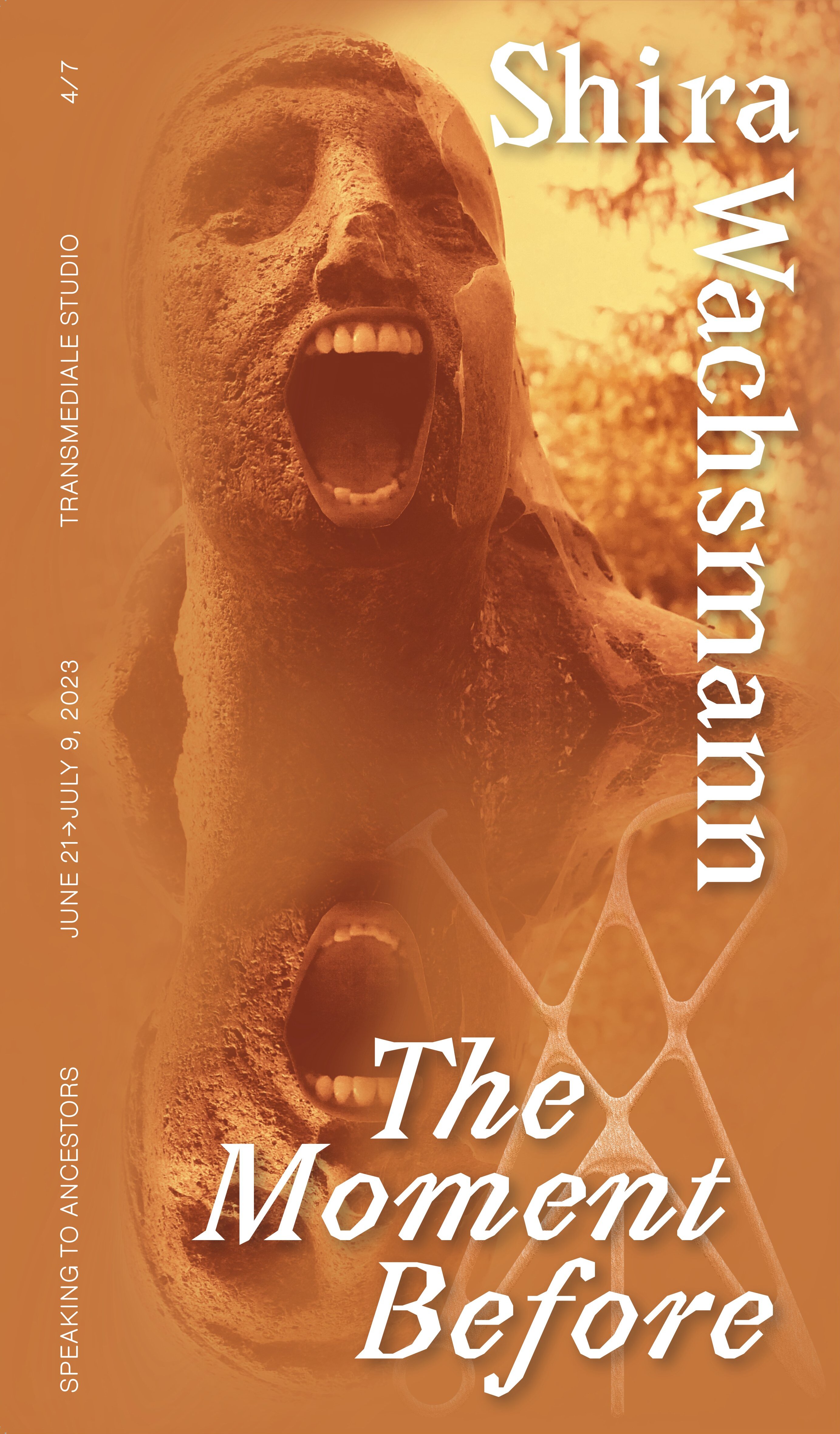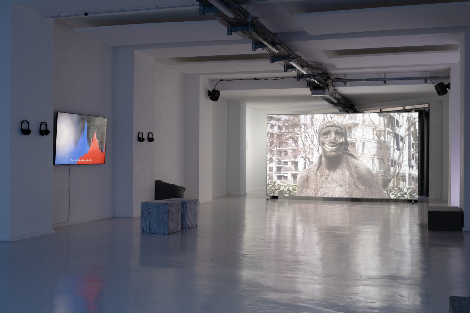 The exhibition is complimented by an augmented reality installation that is activated by visitors in the outdoor space of the Silent Green. A smile without a body keeps repeating eerily as a pattern in the landscape. Even though this digital fragment is foremost invisible, it is always present. The installation only fully reveals itself when it is seen by several viewers from multiple angles. Wachsmann’s works ask if there is a way outside of the explosion, or if we can reshape the connection and relation in the “moments before the explosion” that take shape in correspondences. World War II, the destruction, the blood, the myth, the future climate catastrophe, Germany, Israel/Palestine. Trauma manifests itself as landscape in The Moment Before. In the real, in the virtual as well as in the interconnected collective space and like a Möbius strip, it has neither beginning nor end.