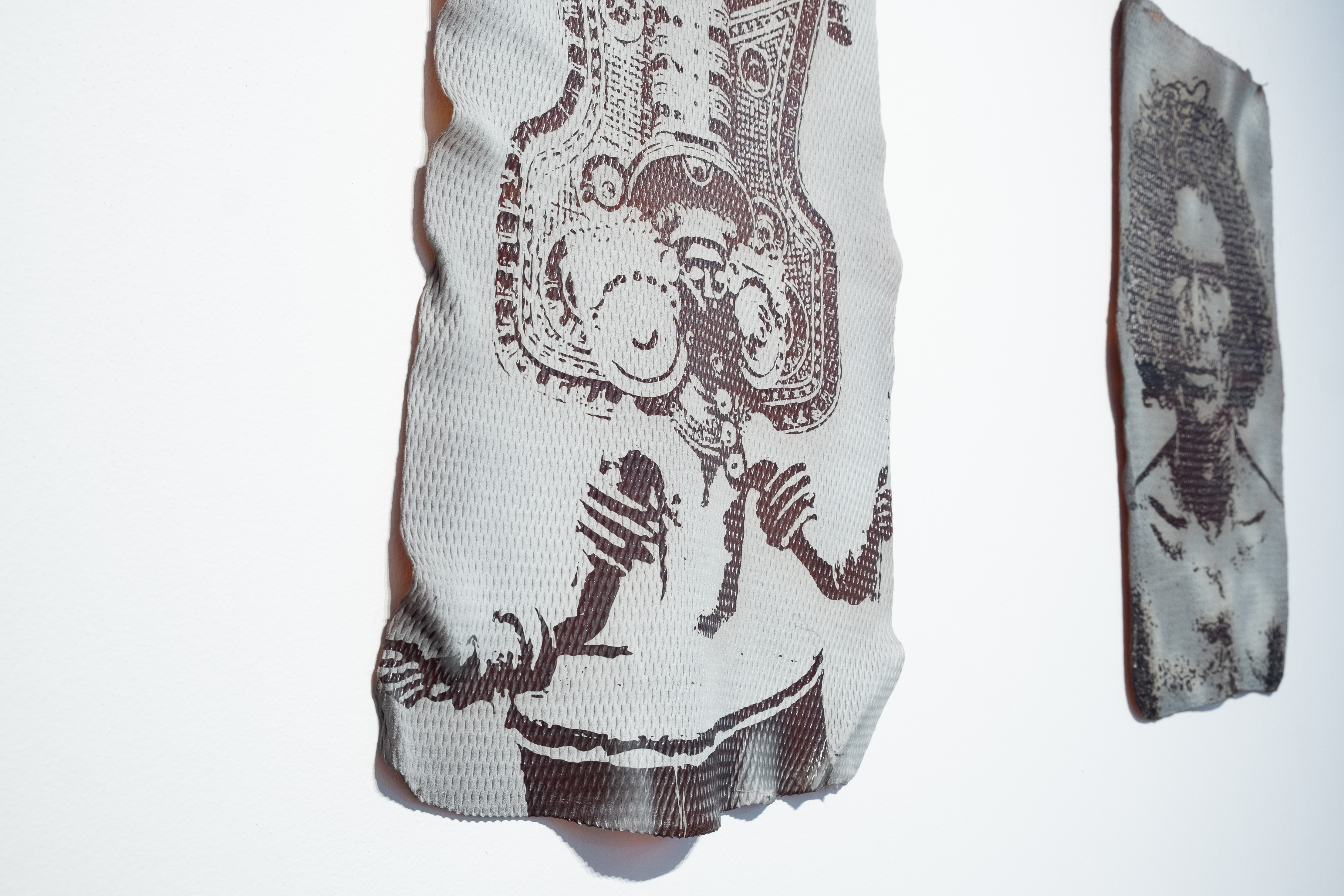 Mani creates a “counter-gaze” on the European eye during the era of colonialism. His installation Gazing back (2024), a serigraph on natural raw rubber sheets, a medium with a deep connection with the artist’s family legacy of labor, depicts a series of enlarged eyes of his portrayed ancestors, who were then captured by Europeans as “foreign” and “different” for their inventory purposes. The silkscreened rubber sheets have been sewn together by the artist to form a collective memory confronting visitors to the exhibition. Also, the monitor included in his video installation Dream walks of a Haemodracon riebeckii (2024) is rubber-wrapped, surrounded by a pile of fresh soil and a stone. It shows the artist in traditional attire visiting the grave of Emil Riebeck (1853-1885) in Halle-Saale, Germany. Time, space, and history collide in this work, raising questions about what it means to encounter beyond ideologies, what it means to be dead or alive, who ultimately measures whom, and what colonialism has ultimately left behind in the present.
