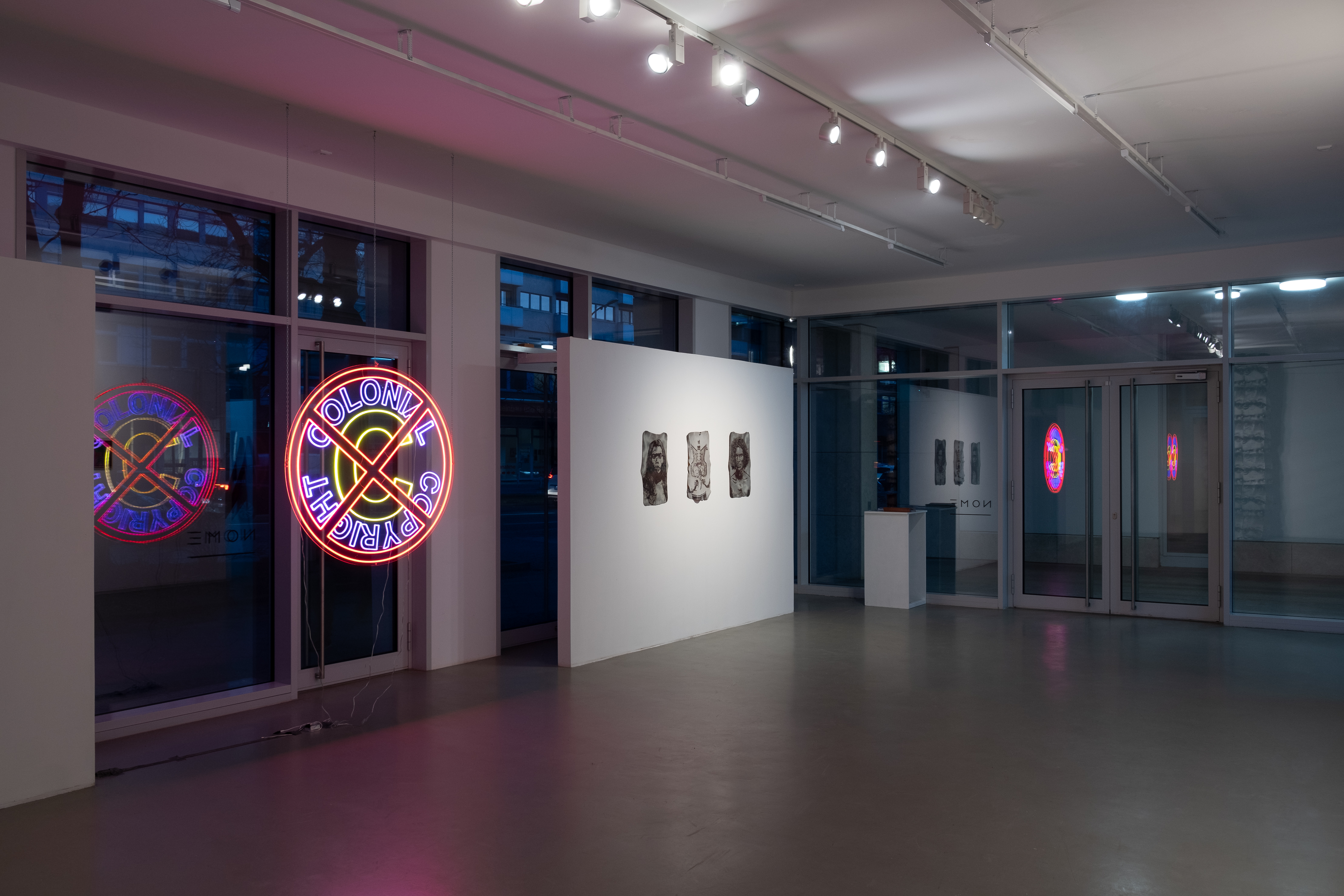 Mani’s performance Expedition Mani (2024) is inspired by the ritual Gulikan Theyyam, a popular ritual dance in the Dravidian tradition from Kerala, where he comes from. In this ritual, human bodies of a lower-caste ceremonially transform into those of deities. Expedition Mani represents a physical and discursive challenge to the hegemonic thinking that western archives narrate. Through ritualised chants and dances, Mani invites the visitors to become a part of a performative procession from The Gate of Sanchi at Schlossplatz, Berlin to Potsdamer Platz and finally to NOME Berlin, where the exhibition will be inaugurated by his arrival. The artist is going to embody the demi-god Gulikan, a Dravidian power worshipped as one of the snake deities whose duty is to protect the Scheduled Castes and Tribes from environmental problems. In the exhibition space, Mani installed a neon sign showing a crossed C for Colonial Copyright (2024) right at the entrance. Alongside colourful drawings depicting hybrid humans and more-than-human species against the backdrop of magazines from the region Malabar reflecting their peoples own history, ritual music from Kerala, and the costume and the instrument he wore during the performance, the exhibition evolves into a resonance space echoing the resurrection of his ancestors’ own narratives.