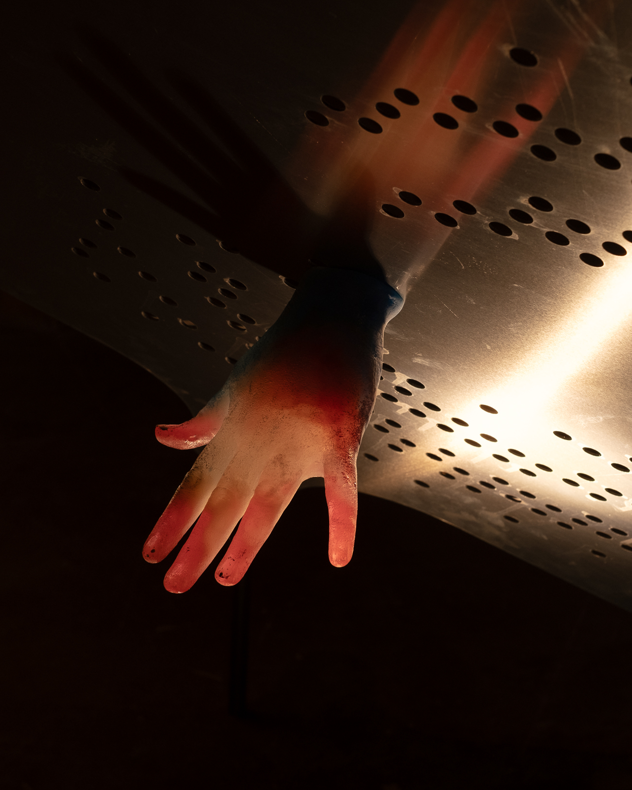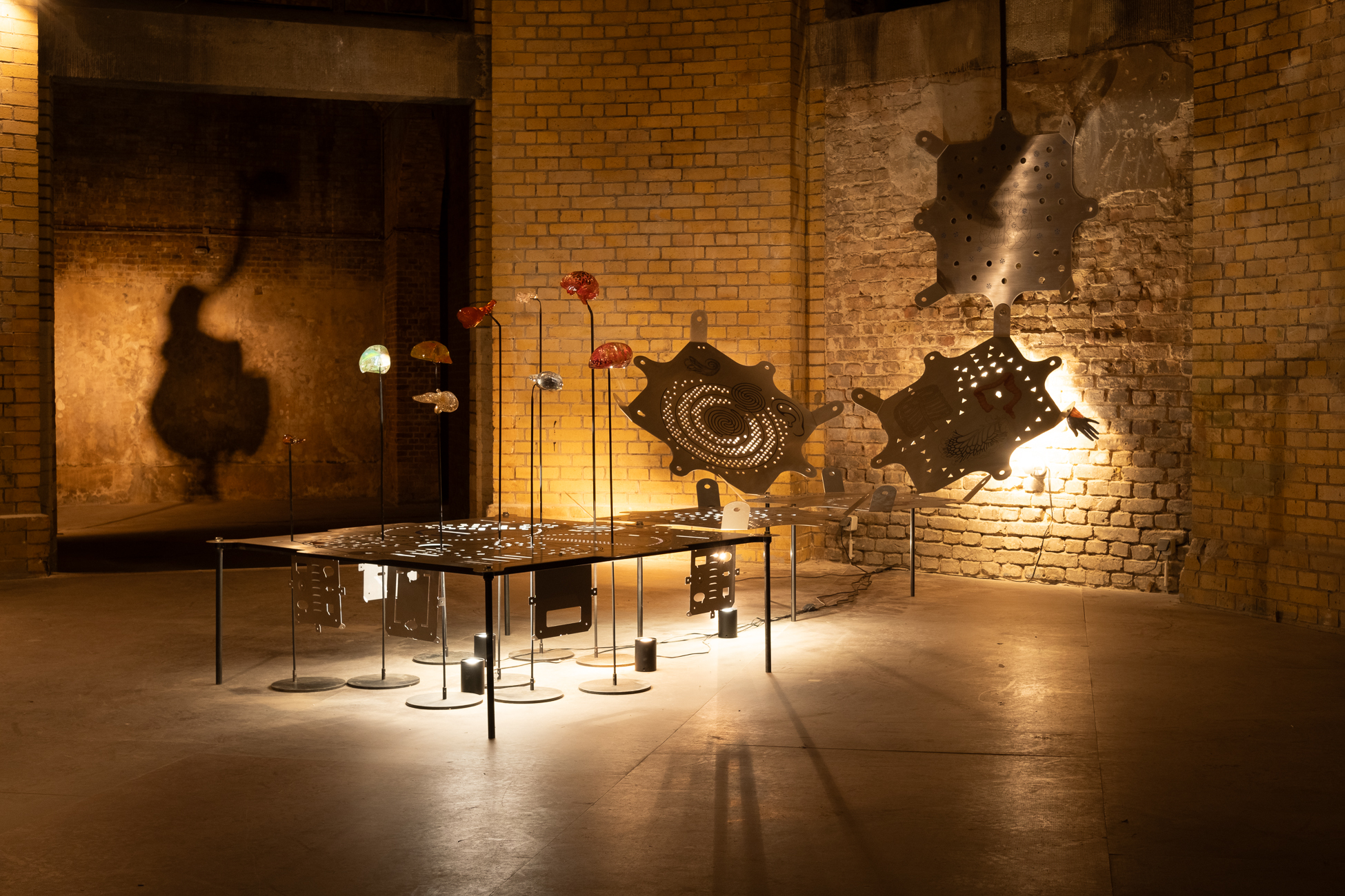 The Irish-German artist Mariechen Danz (*1980) places the human body at the center of her practice. In sculptures, drawings, costumes and installations – often in collaboration with other artists or musicians – she explores the history(s) of media as data carriers, and questions the communicative capacity of language, common practices of mediating knowledge, hierarchies of signs and the primacy of Western notions of reason. Danz additionally activates her installations with staged vocal performances. In View From Above (a song from her sound album Clouded in Veins) at the Kleiner Wasserspeicher, Danz directs the gaze from the earth to the sky and vice versa. In her ongoing series of metal glyph structures (in collaboration with Genghis Khan Fabrication Co.), punched-out, coded and printed aluminium plates are installed in various arrangements to convey knowledge and information across the boundaries of time and space. Patterns of vents meet punctuation marks and icons from digital communication; stylised planispheres meet anatomical representations from different cultures and eras. Like modular carriers of knowledge, they become a new vocabulary and serve in the exhibition as shadow-casting patterns and reflective media for light that create their own star maps.