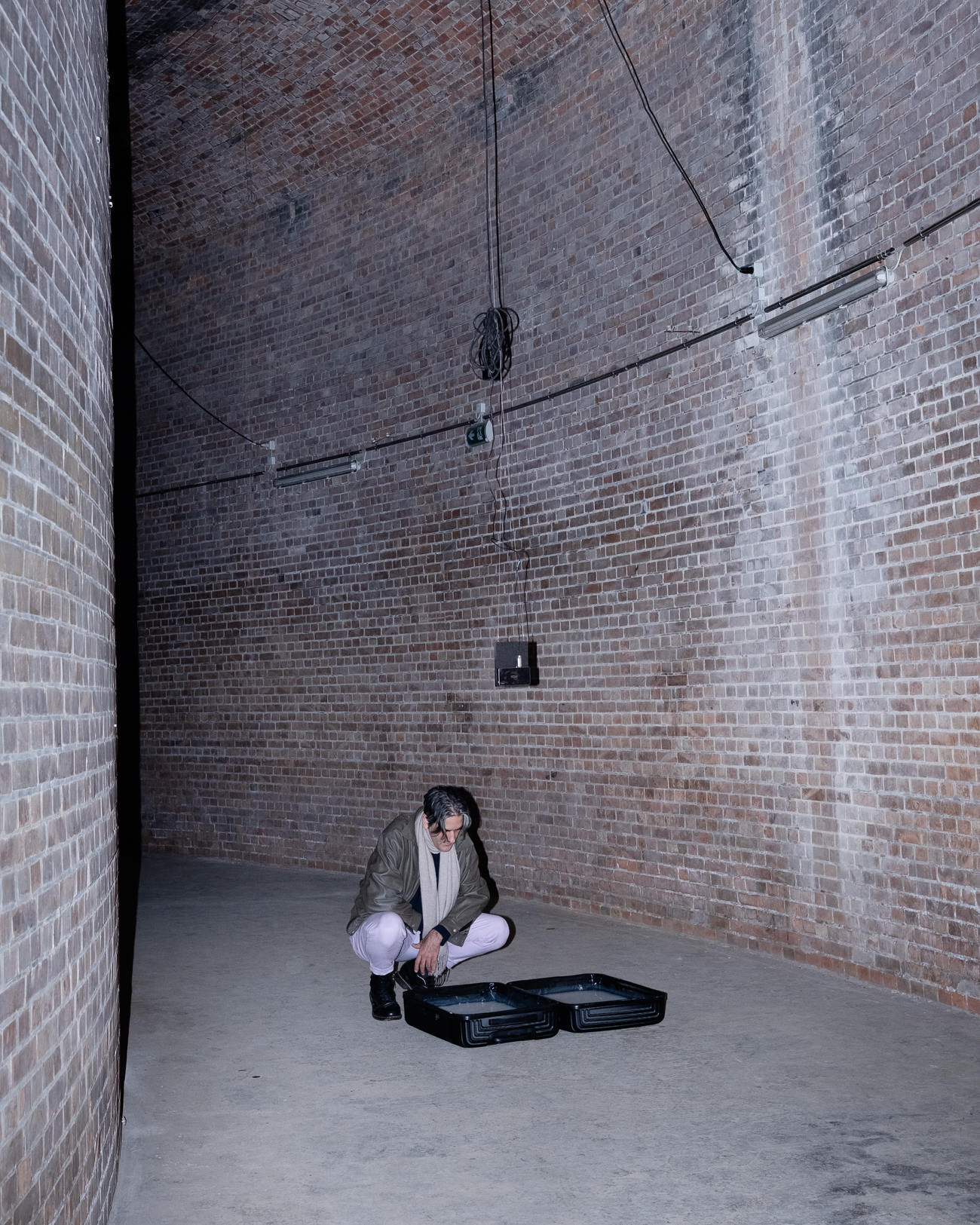 Mariechen Danz installation communicates with The Small Water Reservoir, a round brick hall with masonry pillars and round arches, with its stage-like, visible centre. The smooth cement screed as a floor and the symmetrically arranged flights of stairs are further architectural features.
